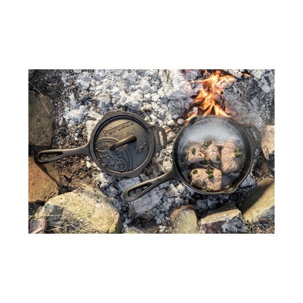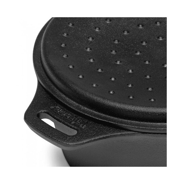Petromax puodas plokščiu dugnu su derančiu dangčiu ir rankena.Dėl nuostabių ketaus savybių ir ypatingos paviršiaus struktūros šiluma yra efektyviai kaupiama ir paskirstoma. Petromax ketaus gaminiai yra gamykliškai paruošti ir padengi maistiniais riebalais, dėl to jie gali būti naudojami iš karto. Ketaus puodai gali būti naudojami virš laužo, krosnyse ar okraitėse, jie puikiai veikia ir ant indukcinių viryklių.Medžiaga: ketus Matmenys 11,4 x 35,1 x 18,6 cm Talpa: 1 l Svoris: 3,1 kg