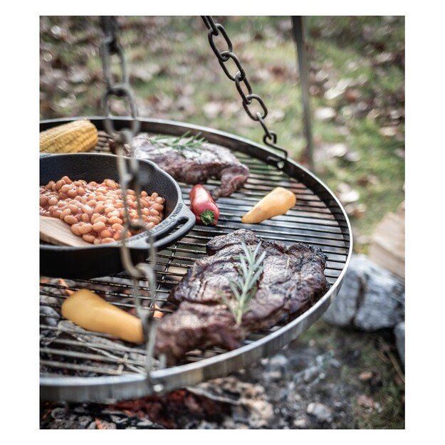Kabančios grotelės Petromax kepimo trikojiui leidžia originaliai kepti mėsą ir daržoves tiesiai ant ugnies. Medžiaga: plienasGrotelės skersmuo: 50 cmAukštis kraštas: 2,7 cmSvoris (bendras): 2,3 kgIlgis (bendras): 37 cm