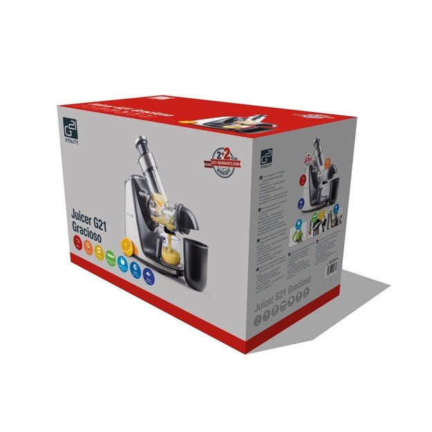 Tvirtos konstrukcijos ir kokybiškų medžiagų dėka „G21 Gracioso“ yra geriausias pasirinkimas tiems, kurie ieško aukštos kokybės sulčių sulčiaspaudės. Jos variklis, turintis 200 vatų galią, neturės problemų perdirbdamas net ir sunkiausias šaknines daržoves, tokias kaip morkos ar salierai, ir kartu su nerūdijančio plieno sraigtu širdies plakime sukurs sveikas sultis, pilnas vitaminų ir maistinių medžiagų.